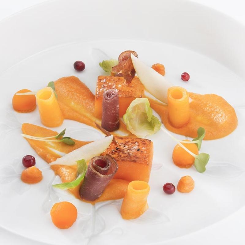 Calabaza asada: cortar la calabaza en dados y dorar rápidamente en aceite de colza con pimienta Voatsiperifery (pimienta salvaje de Madagascar), sal y una nuez de mantequilla para terminar. Hornear durante 15 minutos a 150°C. En el momento en el que esté, aderezar con un poco de flor de sal.