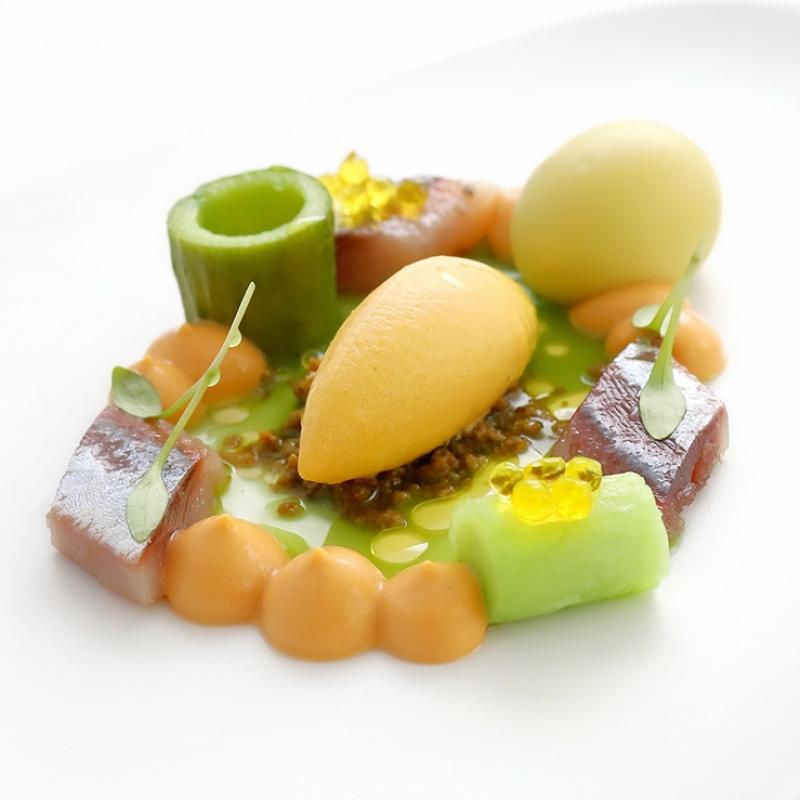 - Para el licuado de pepino, lo licuamos y texturizamos un poco con xantana. Para el pepino encurtido lo marinamos con el vinagre arroz. El lomo de sardina lo cortamos en tres y reservamos. La falsa oliva la haremos rellenando un molde de oliva con el licuado de la lata y el caldo y una vez congelado bañamos con manteca de cacao.