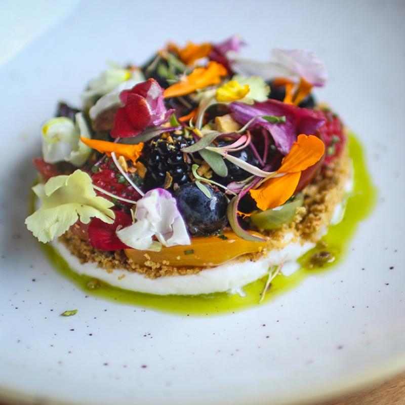 - Emplatar con cuidado la mezcla de frutos rojos sobre la burrata.