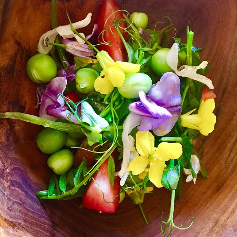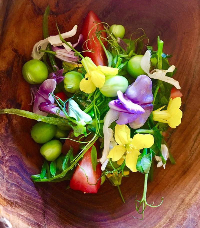 Cortar los cilindros de manzana a 3 cm, colocar la pulpa de los guisantes en el centro del plato, añadir los guisantes salteados y distribuir las hierbas, las flores, las hojas y las medias frambuesas perfumadas con los diferentes aceites y las manzanas.