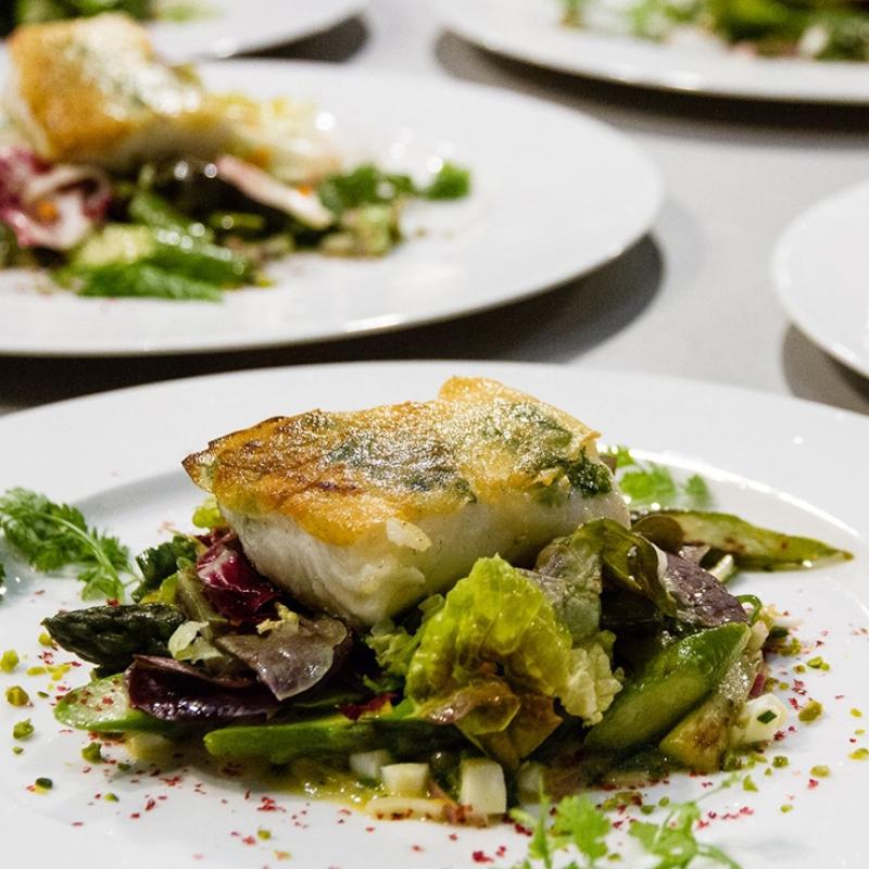 Filete de lucioperca del lago Constanza con crujiente de cascara de patata sobre ensalada de temporada con vinagreta