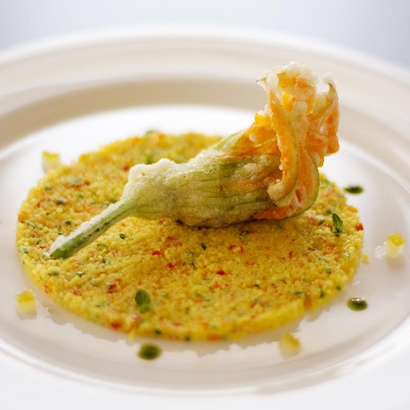 Flor de calabacin frita rellena de garbanzos con cuscus con vegetales y curcuma