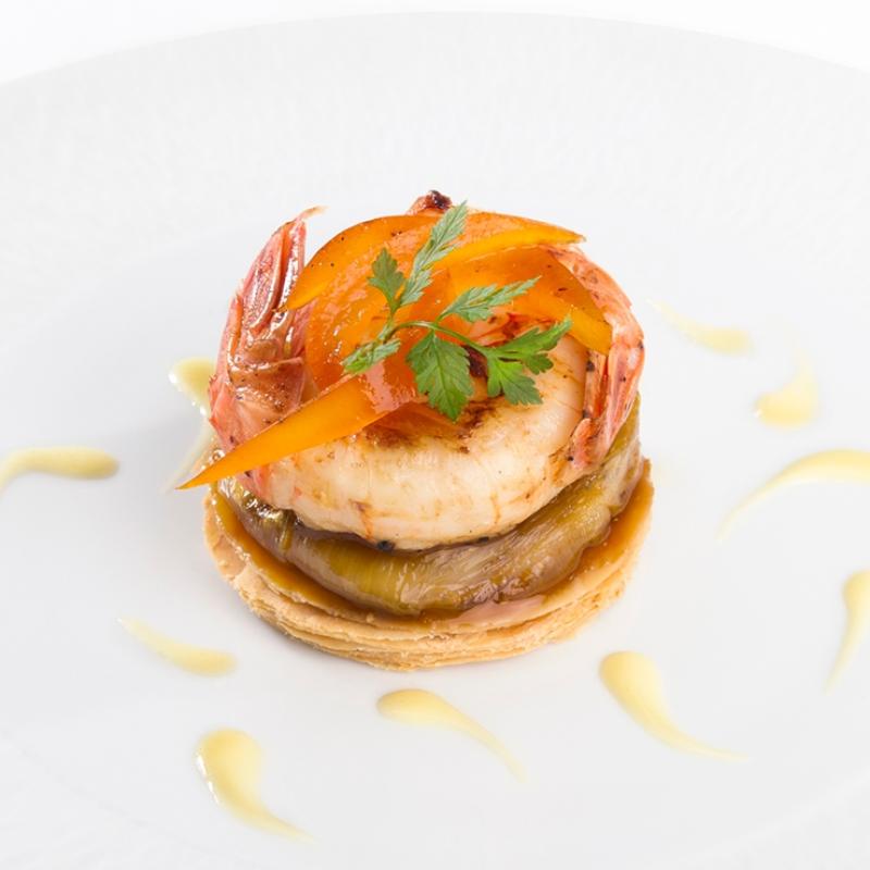 Langostinos grandes, recien cogidos, tatin de endividas caramelizadas a la naranja, pomelos confitados y mantequilla blanca