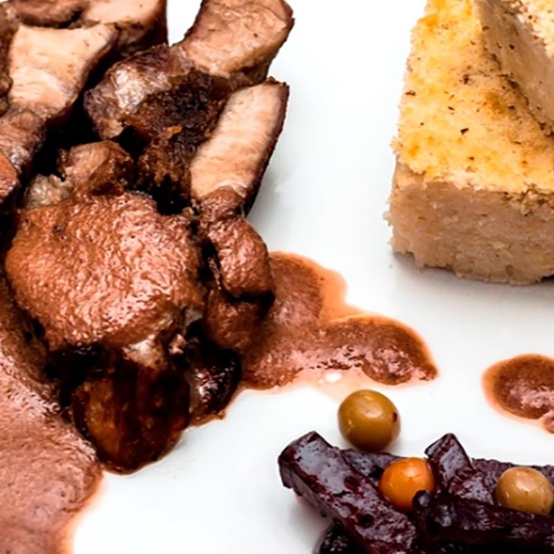 - Para servir, cortar el lomo en rodajas con una porción del pastel de mote, el salteado de betarraga y arvejas y la salsa.