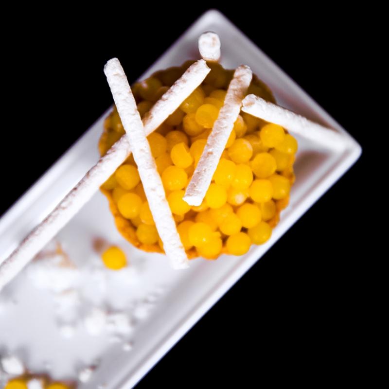 Masa sablée de albaricoque; Crema con albaricoque-caramelo-miel; Perlas de calamansi-fruta de la pasión con miel; Merengue para decorar.