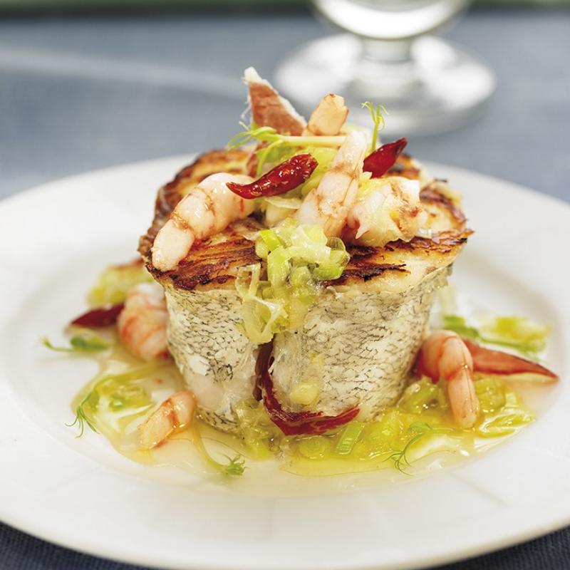 En una sartén con un poco de aceite de oliva, sofreír la guindilla, los ajos tiernos y los langostinos. Cuando estén al punto, añadir el jamón ibérico.