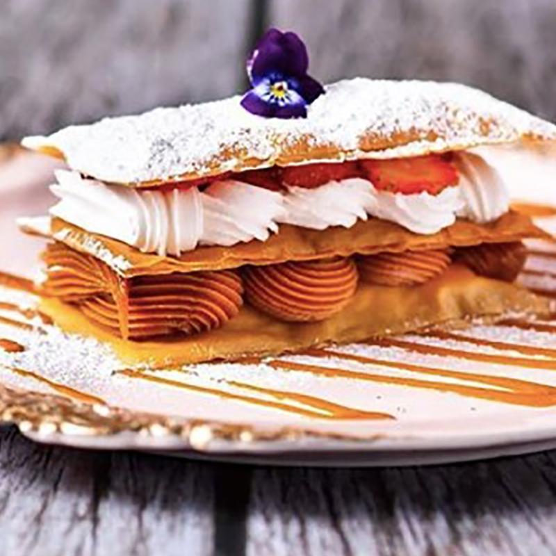 Milhoja de dulce de leche, crema chantilly, fresas y salsa arequipe