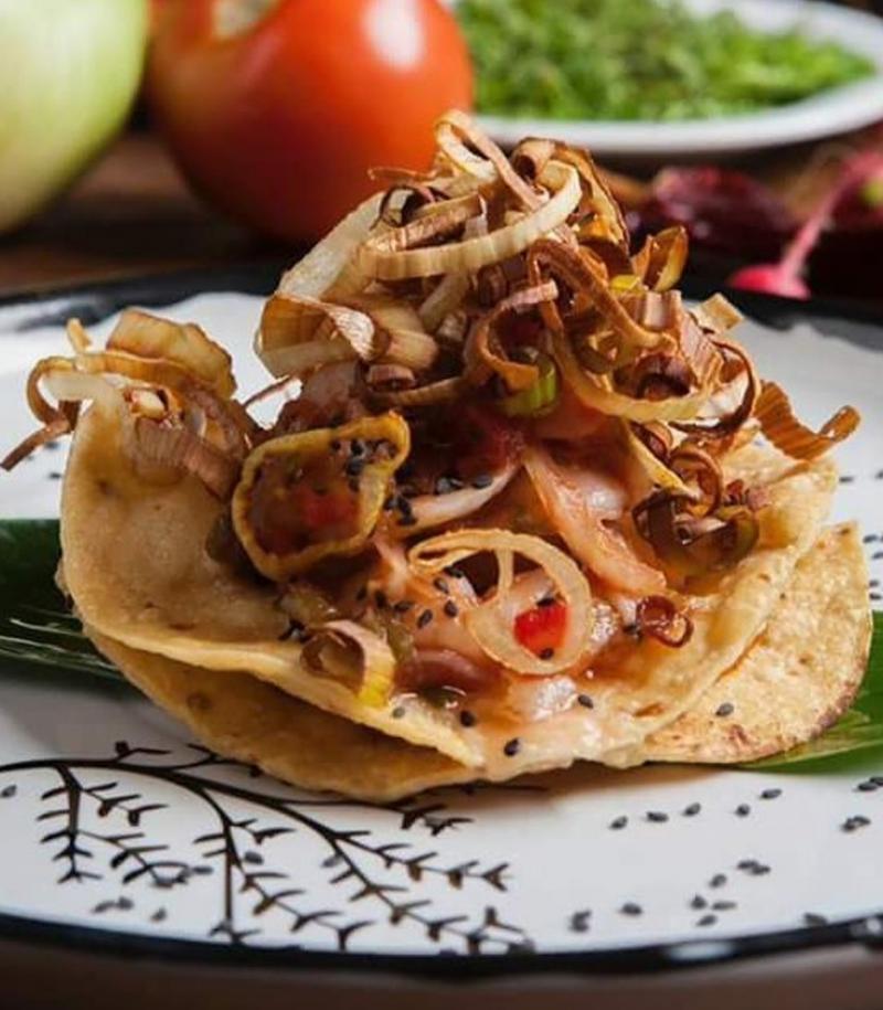 5. Decorar la milhoja con una flor comestible y el plato con la salsa de arequipe.