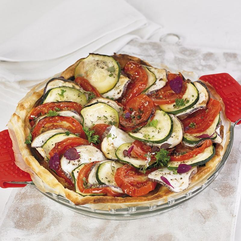 Pintar la base con sofrito de tomate. Intercalar sucesivamente capas de rodajas de tomate, calabacín y berenjena hasta cubrir toda la tarta. Salpimentar cada capa.