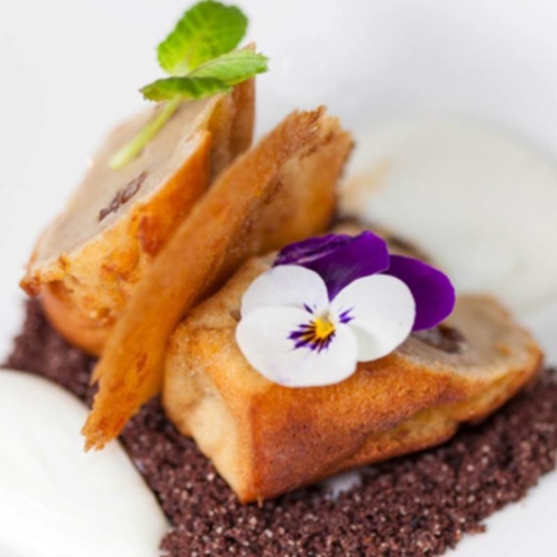 Montaje: Hacer un circulo pequeño en la base del plato plano un poco hondo con la tierra de brownie luego en la base poner un poco de crema inglesa luego una quenelle de plátano salteado cortar el plumcake de plátano es dos trozos al bies previamente caliente del horno unos 4 minutos ponemos unas esferas de queso el crujiente de naranja y al final unos pételos de flores para decorar.