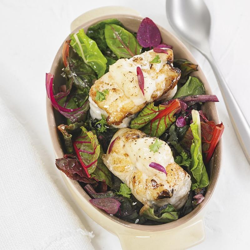 En la bandeja donde se ha cocido el rape, disponer una cama de acelgas, los medallones de rape napados con allioli encima, salpimentar y gratinar