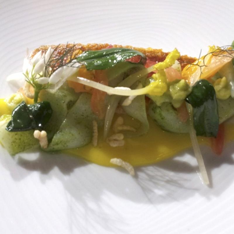 Salmonete asado con perlas de algas y su crema de arroz y azafrán