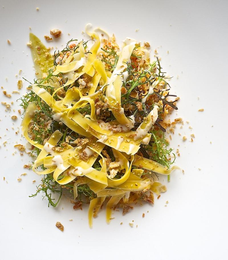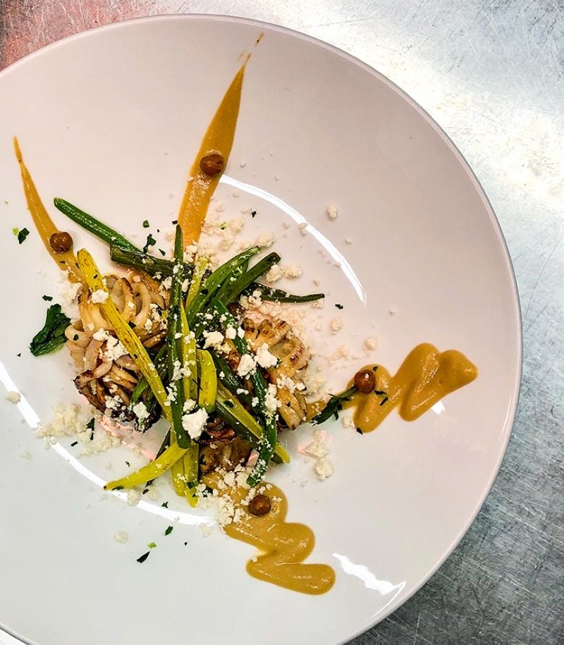 Salmonete rojo, calabaza, Robiola y salsa de almendras