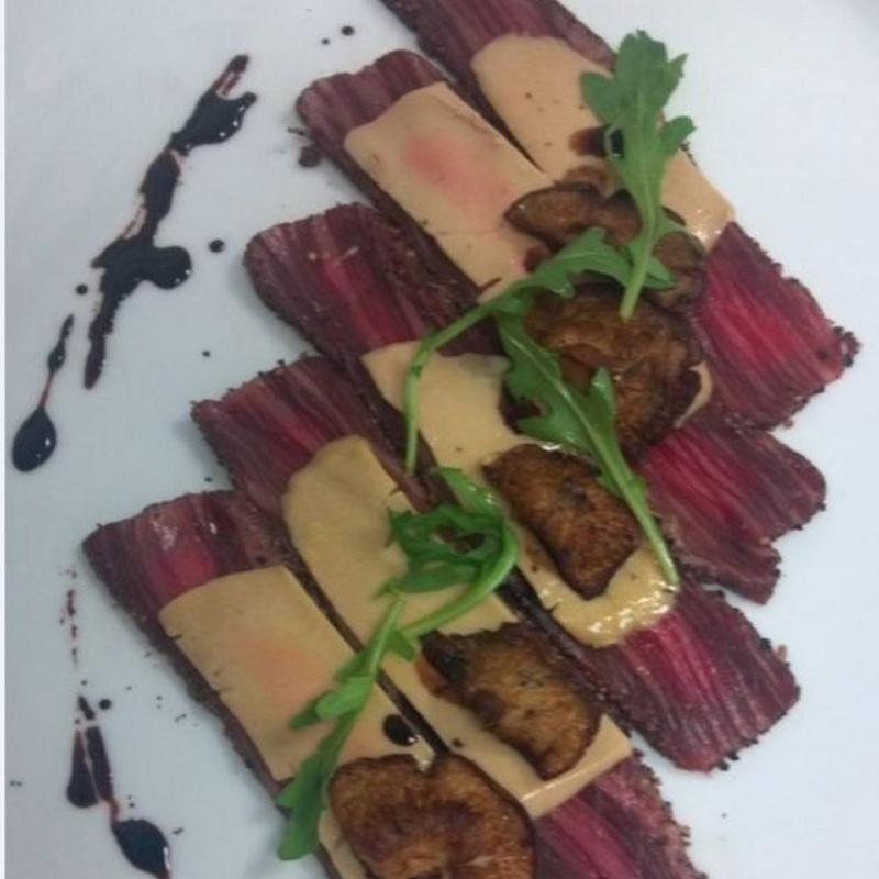 Envolver 1 trozo de foie-gras cortado y 2 trozos de las setas salteadas con cada trozo de los spinalis en salazón. Colocarlos en el plato y dejar una hoja de rúcula silvestre en la parte superior de cada envoltorio. Salpicar glaseado en la parte superior del envoltorio y aderezarlo con la sal rosa. Servir inmediatamente.