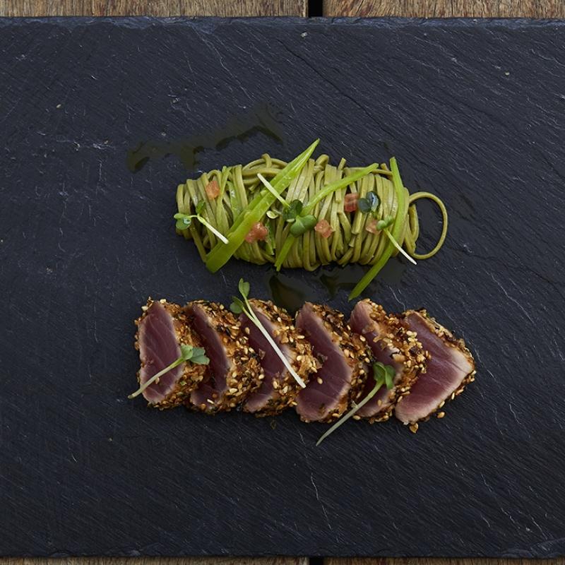 Tataki de atún rojo al gomasio de especias. Ensalada de pasta Soba al té verde. Vinagreta de miel y jengibre