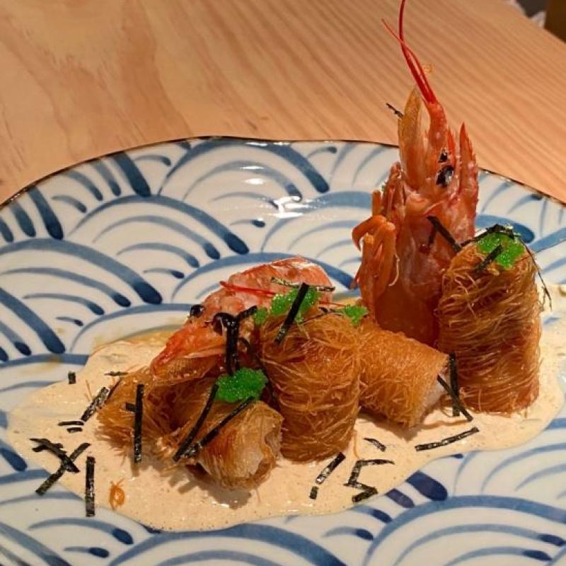 Poner la salsa tártara en el plato y colocar encima los gambones fritos y las cabezas. Guarnicionar con alga nori y tobiko wasabi.