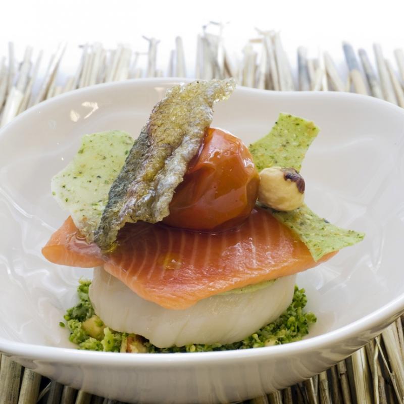 Trucha y vieira, Col, brocoli y salsa de guisantes