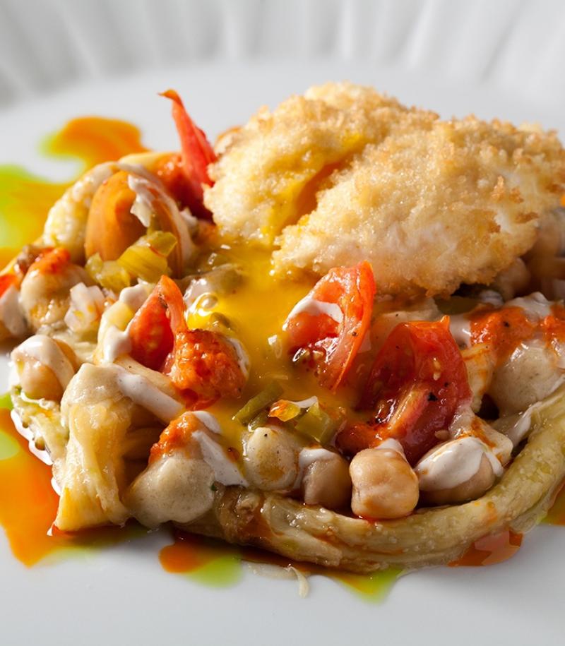 Ensalada de berenjenas asadas a fuego abierto con huevo poche crujiente
