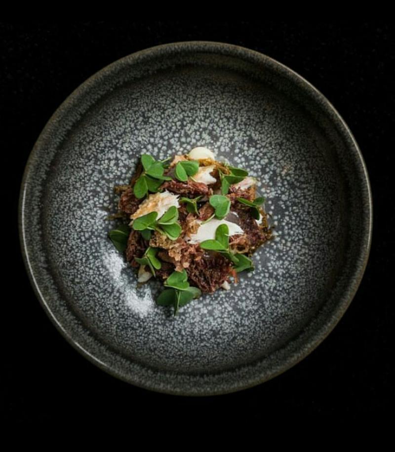 Salmonete asado con perlas de algas y su crema de arroz y azafrán