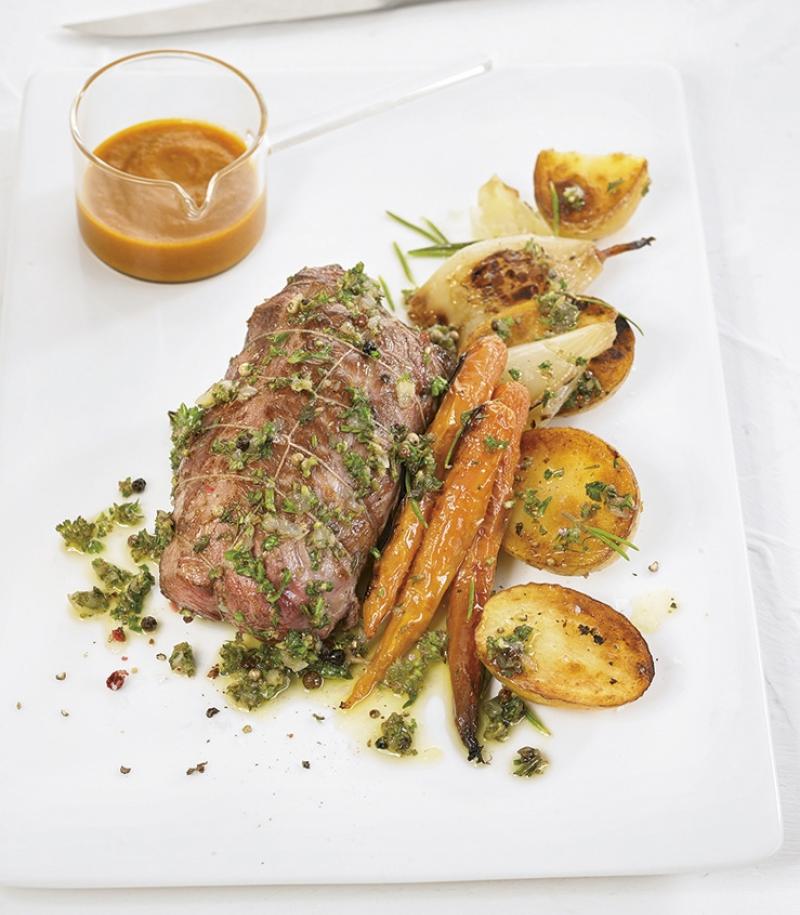Pato, puerro quemado, brotes de lúpulo, trébol, violetas, raíz de cilantro frita, hojas de ajo