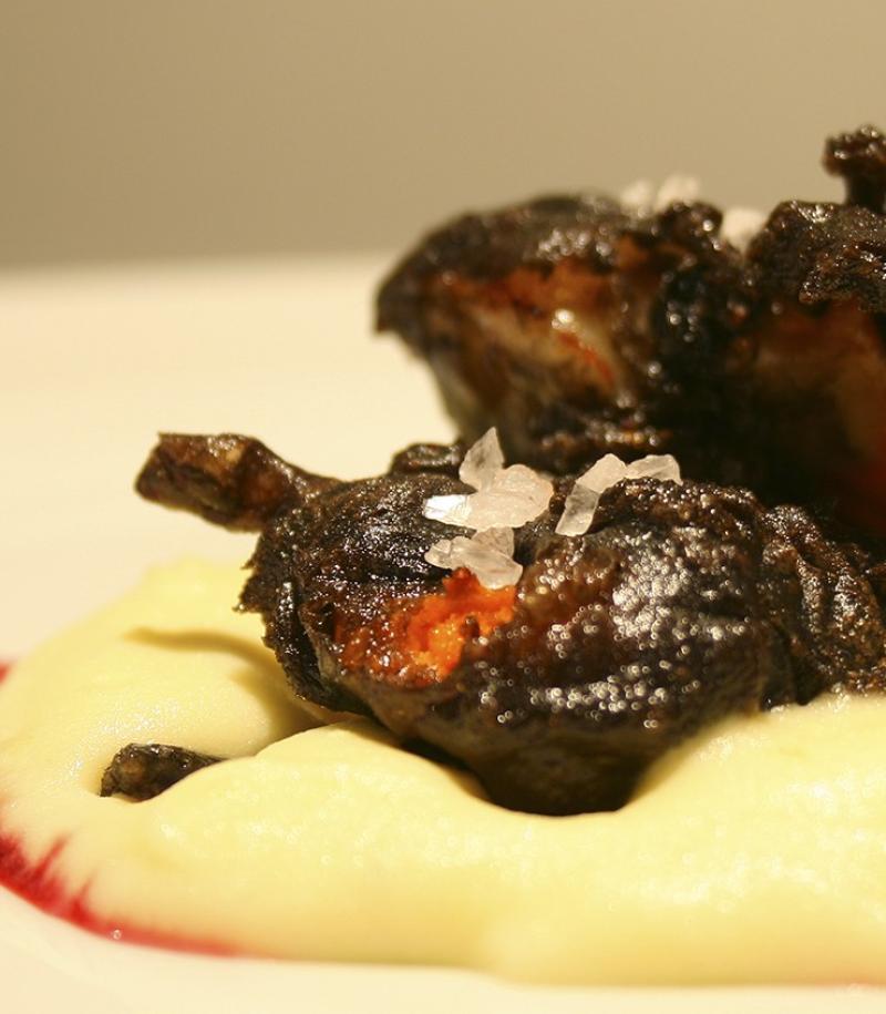 Vieiras en tempura de tinta negra con la patata y el jengibre crema